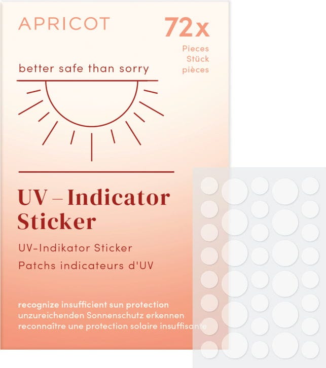 Las pegatinas indicadoras de rayos UV de APRICOT te ayudan a saber cuándo tu piel no está recibiendo la protección solar adecuada. Al cambiar de color, las pegatinas muestran la intensidad de los rayos UV sobre tu piel. De esta forma, siempre sabrás cuándo es el momento de volver a aplicar la protección solar. Las pegatinas son resistentes al agua y al sudor.