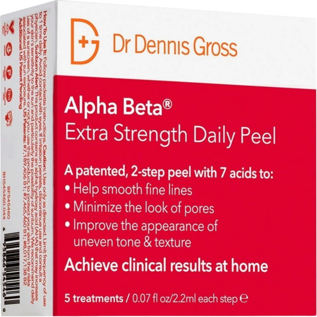 El renombrado Alpha Beta® Peel Extra Strength es un exfoliante limpiador antiedad del Dr. Dennis Gross que combate los primeros signos del envejecimiento, como el tono y la textura irregulares de la piel, las líneas finas y las arrugas, así como los poros dilatados. Enriquecido con siete ácidos y gracias a una fórmula bifásica patentada, el exfoliante actúa de forma extremadamente fuerte y eficaz, a la vez que resulta fácil de usar en casa.