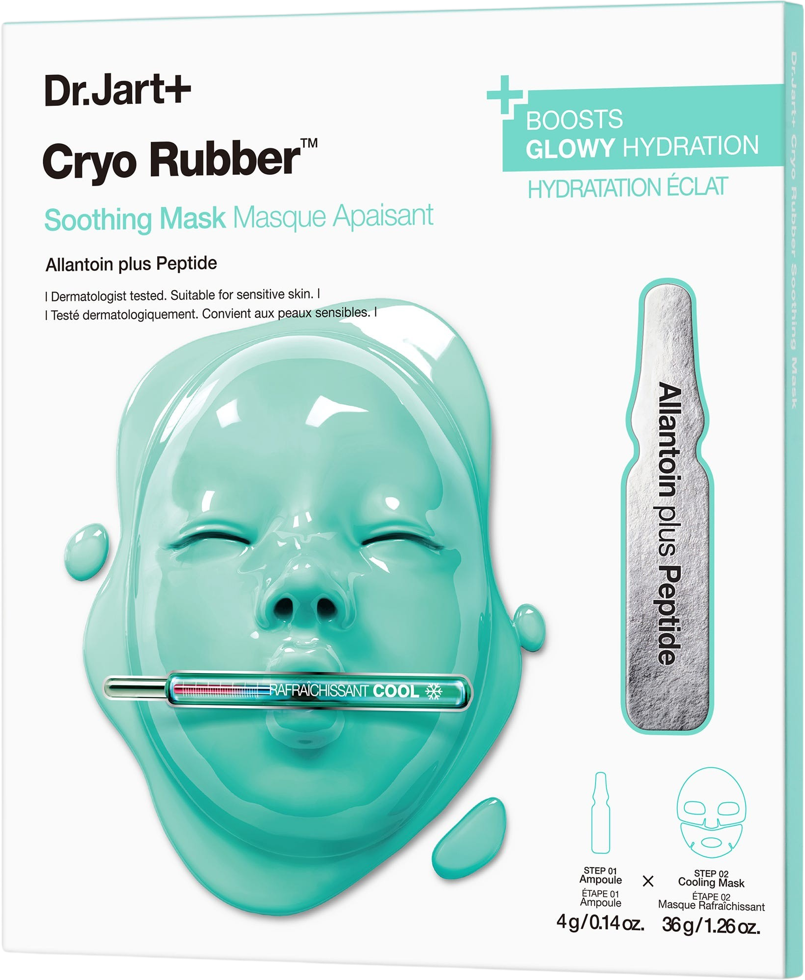 La Cryo Rubber™ Soothing Mask de Dr. Jart+ es una mascarilla facial que ayuda a reequilibrar la piel sensible, irritada o estresada. Además de la mascarilla, se incluye un ampollas con un sérum de textura gelatinosa. Este sérum está formulado con un complejo de alantoína, que luego queda eficazmente sellado por la mascarilla. La combinación de esta mascarilla hidratante y el sérum regenerador ofrece una experiencia de cuidado intenso y deja la piel perfectamente hidratada, calmada y suave al tacto.