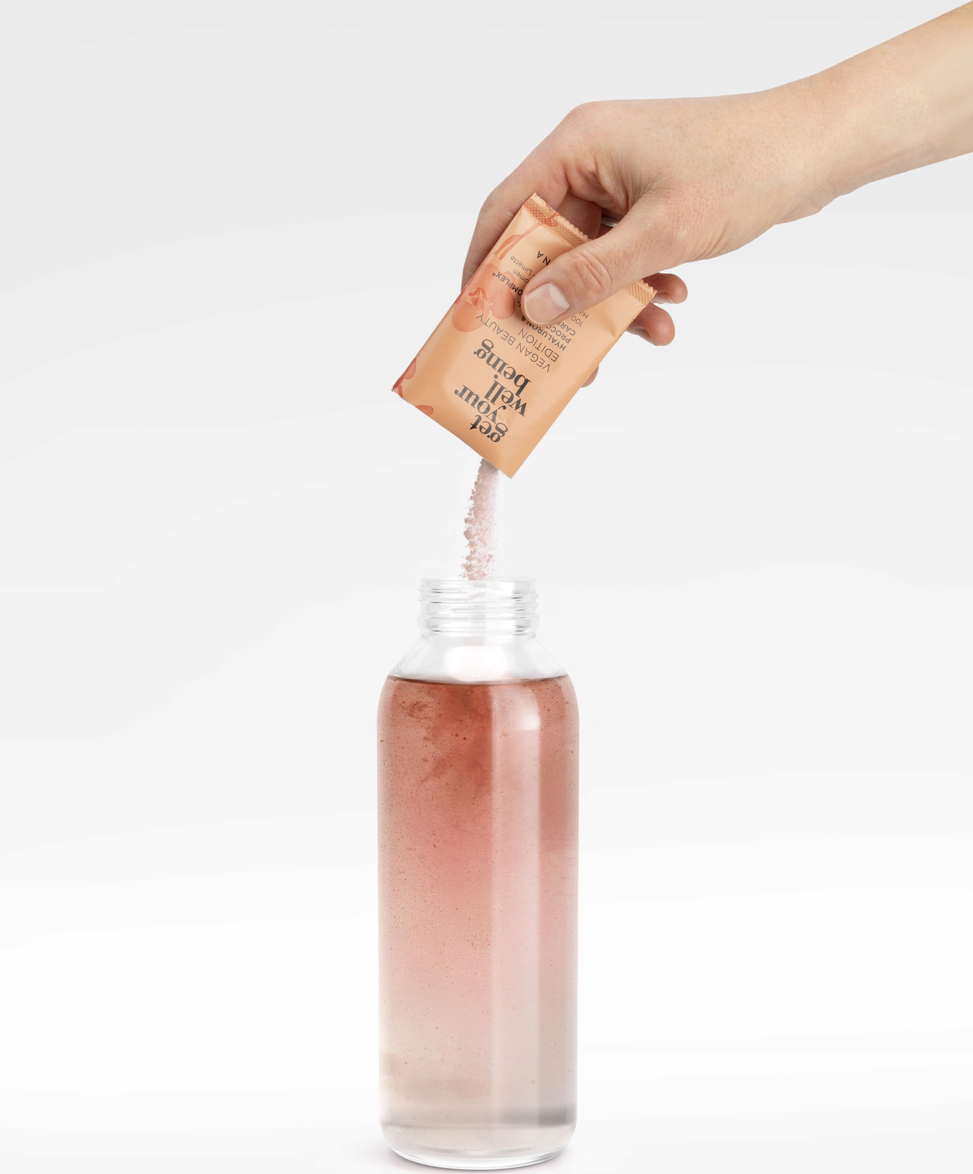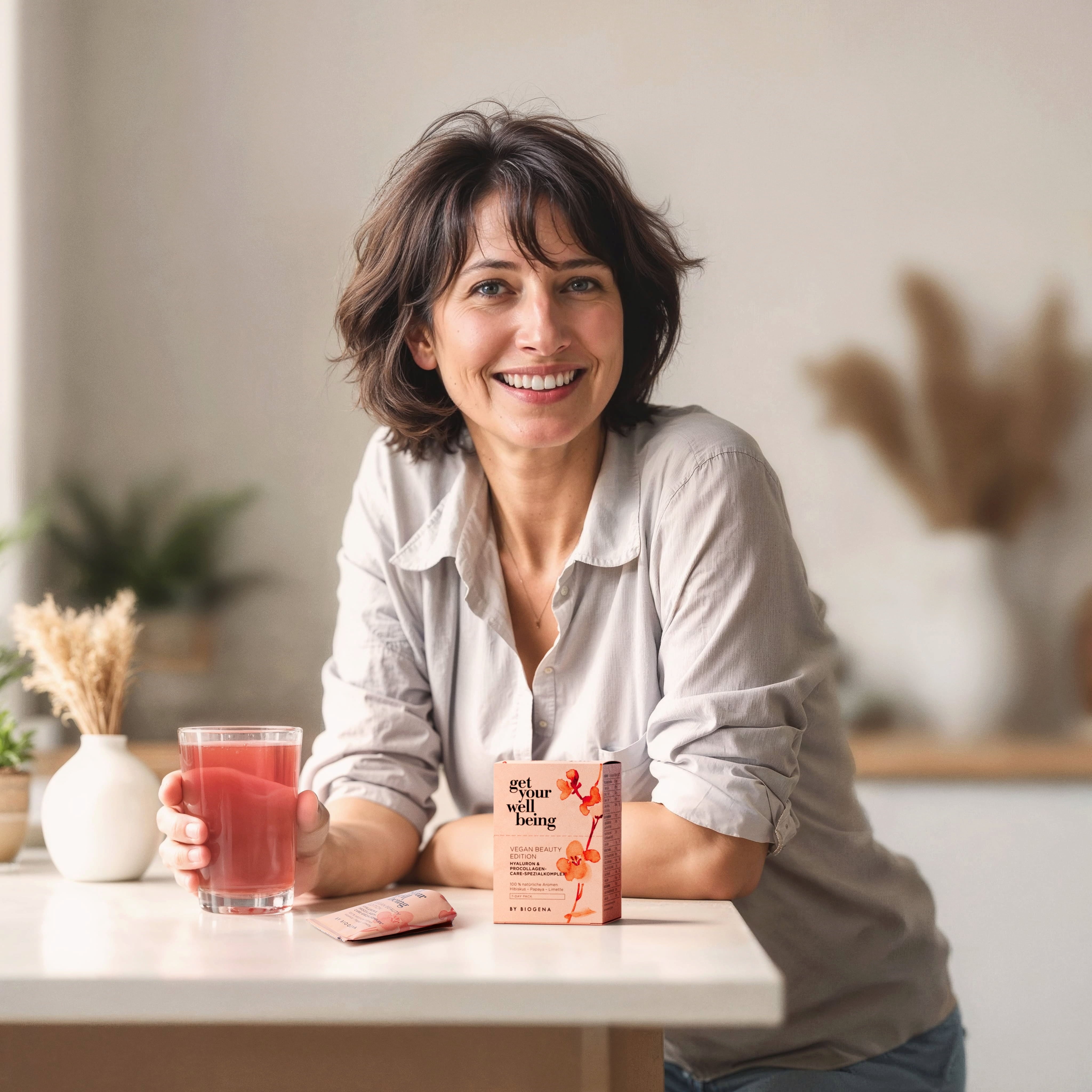 La Vegan Beauty Edition de Get Your Wellbeing de BIOGENA combina ácido hialurónico vegano, valiosos precursores de colágeno y nutrientes esenciales para una piel, cabello y uñas sanos. Se disuelve fácilmente en agua para una rutina de belleza diaria desde dentro hacia fuera, diseñada para realzar tu brillo natural. Beauty & Glow Drink tiene además un agradable sabor afrutado a hibisco, papaya y lima.