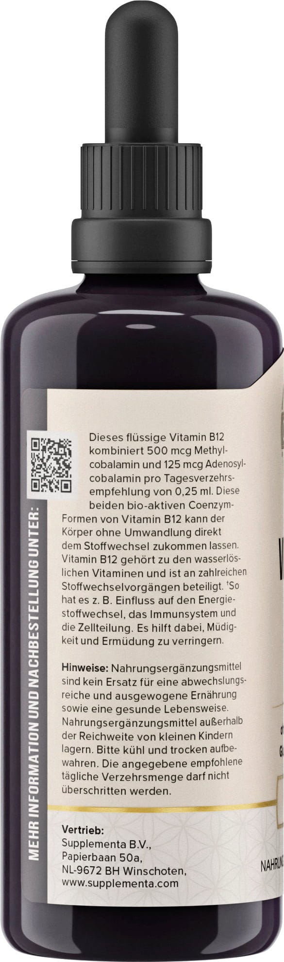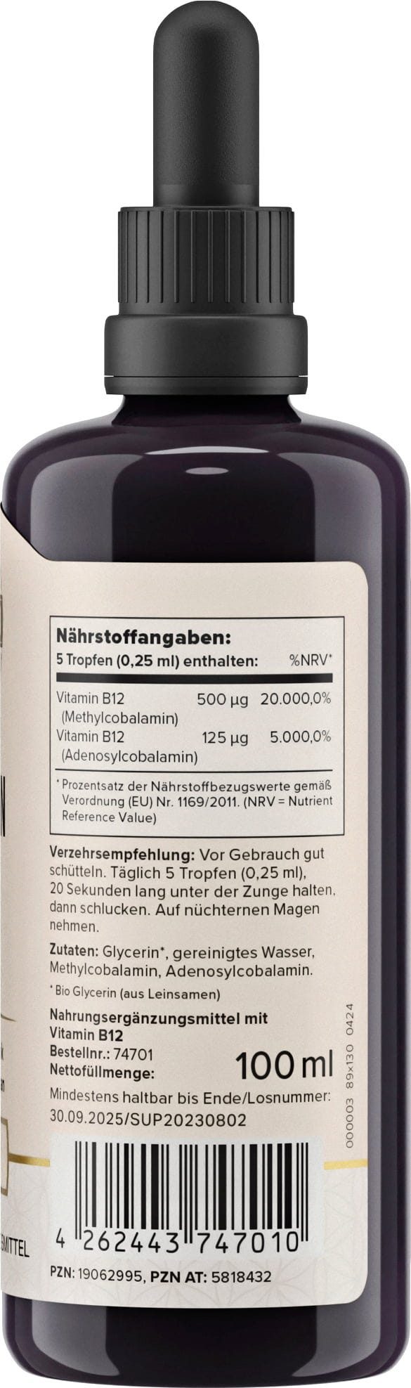 Las gotas de vitamina B12 de i like it clean combinan metilcobalamina y adenosilcobalamina. Ambas formas de vitamina B12 son activas y pueden ser absorbidas directamente por el metabolismo del organismo sin ser convertidas. Las gotas sin alcohol se producen totalmente sin aditivos innecesarios y se basan exclusivamente en glicerina orgánica de linaza y agua purificada.