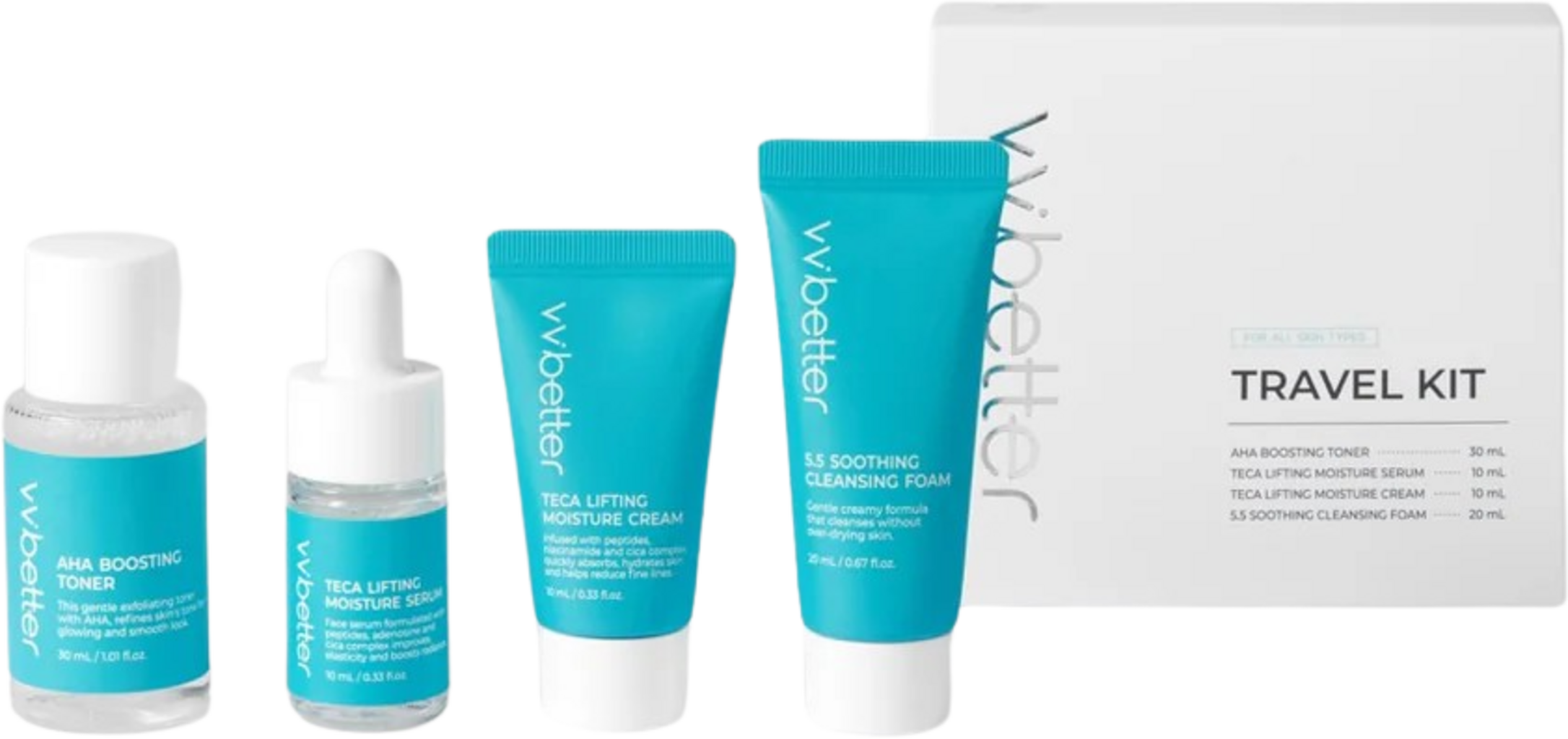 El Travel Kit Blue de VVBETTER ofrece una completa minirutina coreana para una piel radiante, estés donde estés. El set contiene limpiador, tónico, sérum y crema en prácticos tamaños de viaje, ideales para cuando estás fuera de casa, en el gimnasio o probando los populares productos de VVBETTER.